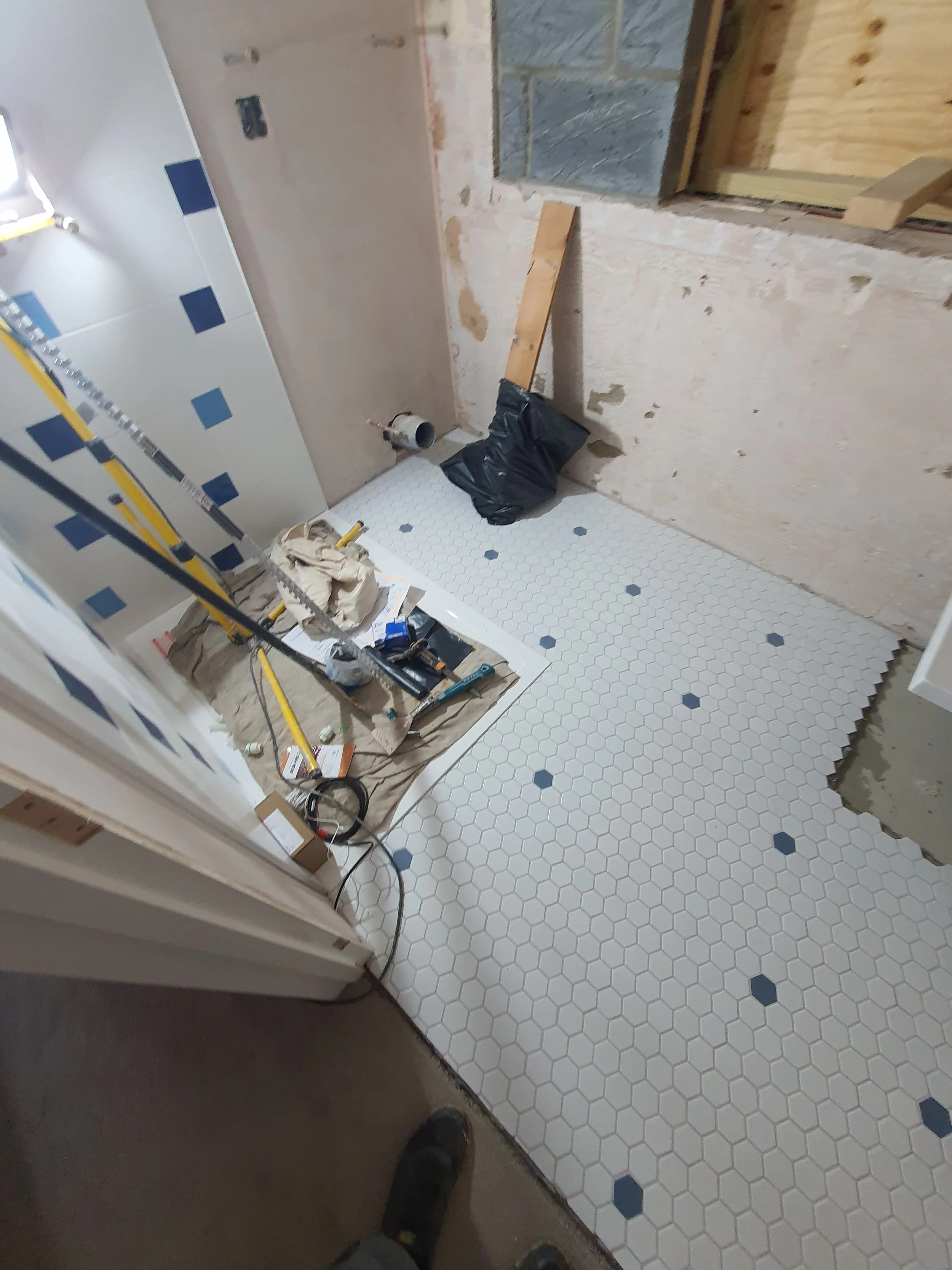 Complete removal and reconfiguration of an ensuite and family bathroom. Works included reconfiguration of rooms including associated pipework, tiling, new window, underfloor heating, a complete strip back to bare shell and renewal.